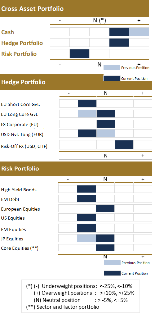 At the same time, we add to our Hedge & Cask portfolio, where we keep USD (& US 2Y rates) in OW together with Cash. We upgrade EU Long Core Gov.s from UW to Neutral. IG bonds are kept Neutral while the position in US Long bonds is reduced from Neutral to now UW.